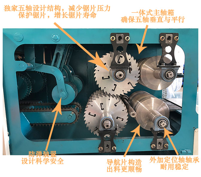 送 料:采用四排尖齒鏈條輸送,機(jī)上配有變頻智能調(diào)速器,可以對大小木料的進(jìn)料速度實(shí)行自由調(diào)速。原木可以實(shí)現(xiàn)自動(dòng)分中,機(jī)上還配有限位開關(guān),防止超去規(guī)格木料進(jìn)入,防止卡木避免對機(jī)器造成損壞。