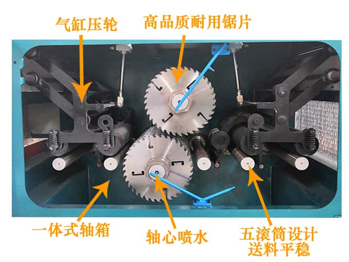 5.采用上下軸鋸設計,具有鋸片直徑小,鋸路小省料的優點。上下鋸設計的鋸片鋸路是正常單軸鋸片鋸路的50%。加工同樣高度的木料其鋸路僅為普通單據軸的1/2。鋸切面光滑平整可以代替刨。節能降耗一次多片加工。送料速度高,大大提高加工效率,上料快,操作簡單,維護保養簡單,上下輥主彈簧壓力,送料平穩,增加鋸片的使用壽命。