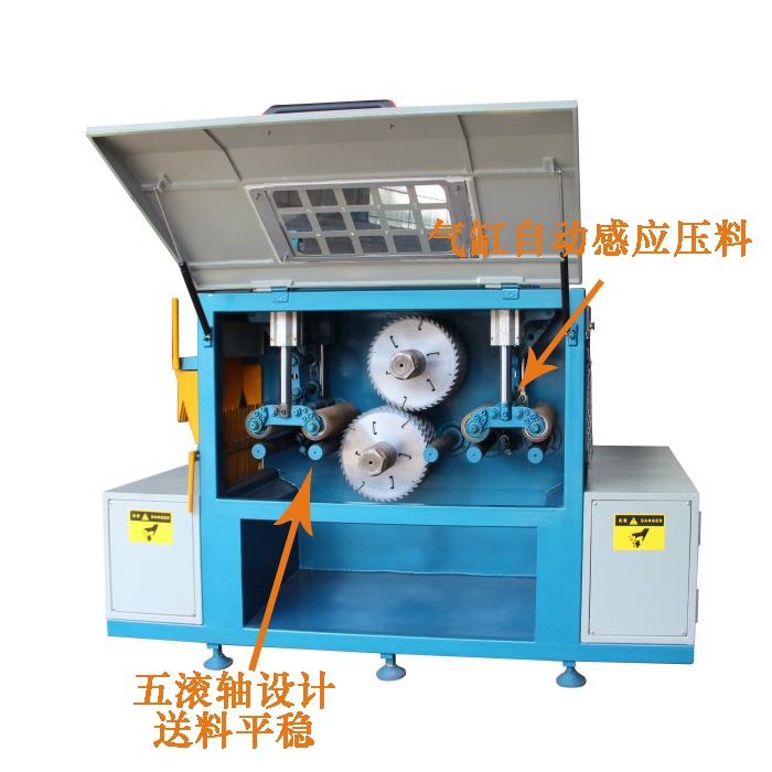 5.采用上下軸鋸設計,具有鋸片直徑小,鋸路小省料的優點。上下鋸設計的鋸片鋸路是正常單軸鋸片鋸路的50%。加工同樣高度的木料其鋸路僅為普通單據軸的1/2。鋸切面光滑平整可以代替刨。節能降耗一次多片加工。送料速度高,大大提高加工效率,上料快,操作簡單,維護保養簡單,上下輥主氣缸壓力,送料平穩,增加鋸片的使用壽命。